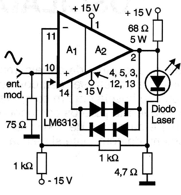With this circuit it is possible to modulate the radiation emitted by a laser diode in amplitude. The circuit uses a National Operational LM6313 Dual Amplifier and requires a symmetrical source. This operational amplifier is a special type of power that can excite high current loads such as laser diodes.