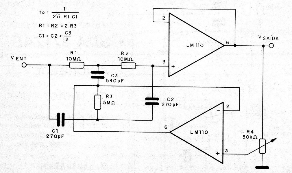We can implement this filter with more modern equivalent operational amplifiers, since the LM110 is uncommon today. The formulas next to the diagram allow to design the circuit for specific frequencies. The circuit requires a symmetrical source and was suggested by National Semiconductor.