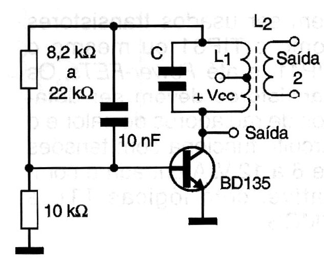 The oscillator indicated can produce signals from 50 kHz (approximately) to 7 MHz, depending only on coils L1 and L2 and capacitor C. The circuit power is of the order of 500 mW with 12 V power. The circuit works with voltages of 6 to 12 V and transistors equivalent to the one suggested, such as TIP31, can be used. For a frequency of 1 MHz, the coil will be formed by 80 turns of wire 28 with a central socket on a ferrite rod 1 cm in diameter and 10 to 20 cm in length. L2 is formed by 20 turns of the same wire over L1. In this case, C will have 470 pF. For 7 MHz, wrap 30 turns of wire 28 in the same ferrite rod, use for L2 10 turns and a C of 100 pF. C can be variable for frequency adjustment. All capacitors must all be ceramic.