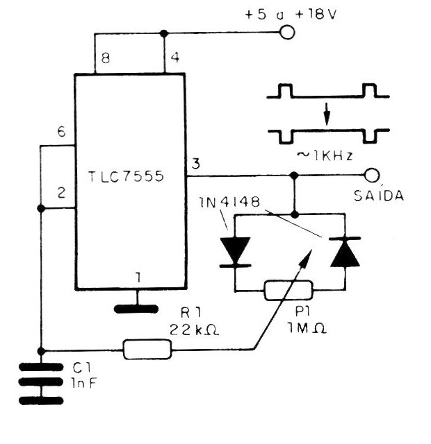 To obtain a signal with a variable mark / space ratio in a ratio of 1 to 20 to 20 to 1, we have the circuit in the figure. The frequency is given by capacitor C1, which can have values between 220 pF and 220 uF. The supply voltage of the circuit can vary between 5 and 18 V. The trimpot (or potentiometer) P1 adjusts the mark / space ratio of the generated signal. There is a small dependence on the frequency of the signal generated when adjusting the mark / space ratio. Pin 4 of the TLC7555 integrated circuit can be used to externally control the oscillator operation. Taken to a low level, it inhibits the operation of the astable.
