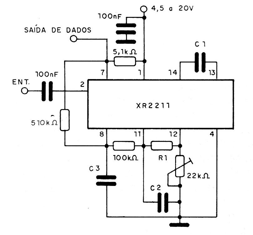 The integrated PLL XFl2211 (Exxar) is used to decode data transmitted by tones R1, C1, C2 and C3 depending on the frequencies of the tones and the transmission speed according to the table: