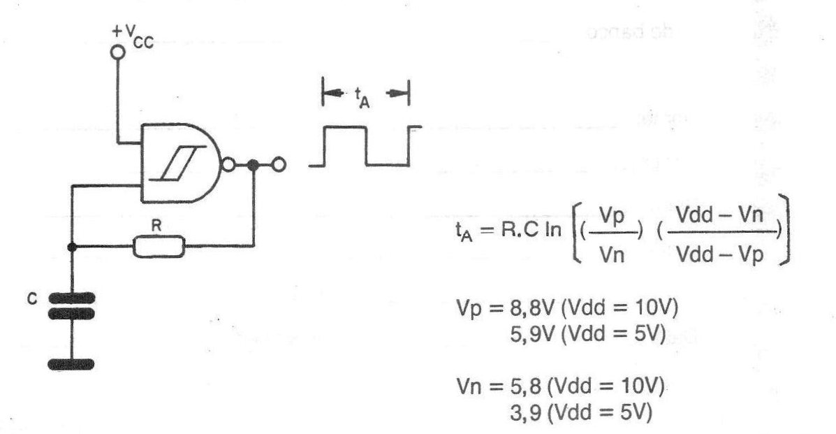 In the figure we have the astable configuration for the 4093 that serves as a clock for frequencies up to approximately 1.2 MHz. The formulas for the circuit are given together with the diagram. The resistor must have values in the range of 50 k ohms to 1 M ohms and the capacitor must have values in the range of 100 pf to 1 uF. However, values lower than 50k ohms can still provide satisfactory oscillations, if, together with the capacitor, the maximum frequency of the integrated, which is approximately 1.2 MHz, is not exceeded.