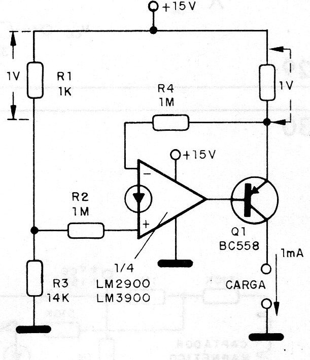 A constant current source can be built based on one of the LM3900 or LM2900 amplifiers, as shown in the figure. A current of 1mA can be achieved in a load with resistance in the range 0 to 12 k ohms, starting from a 15 V power supply. The divider formed by R1 and R2 applies the reference voltage to the non-inverting input, that produces the desired current in the system. Note that 1 V over a 1k resistor corresponds exactly to a current of 1mA, since this current is derived from the emitter of the internal transistor Q5.