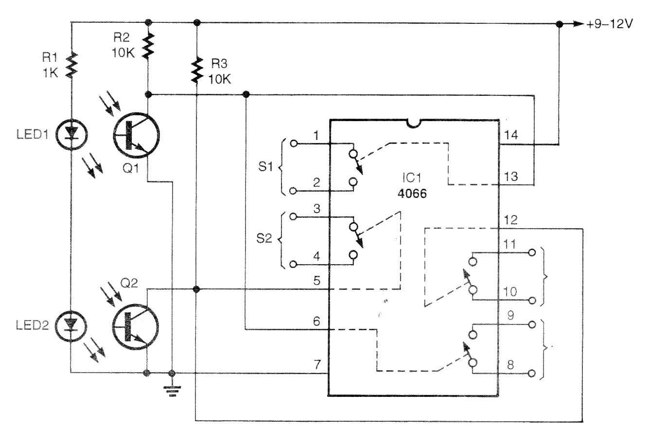 This circuit was found in a 2000 Poptronics. The magazine no longer exists, but the circuit can be easily assembled, as the components used are still common. The LEDs are infrared, and the digitally controlled switches are low current. The photo transistors can be of any type.