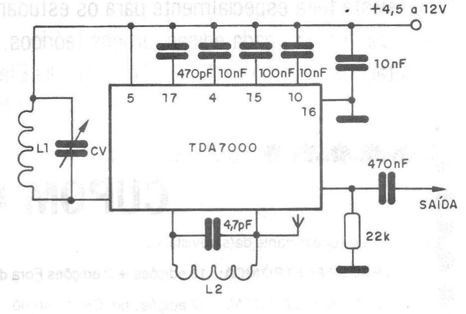 The TDA7000 is a Philips integrated circuit that contains a complete FM receiver with the need for only two external coils and has no adjustments other than tuning. The FL is 70 kHz which does not require the use of external coils and the sound quality is excellent, although the pass-through audio track prevents the use of decoders. The circuit we propose can serve as the basis for an excellent quality pocket FM receiver by connecting the audio output on a small amplifier such as the TDA7050 or TBA8208. The coil L1 is formed by 3 turns of 22 AWG wire in 0.5 cm form without core, while L2 is formed by 15 turns of 22 or 24 AWG wire in form of 0.5 cm in diameter without core.