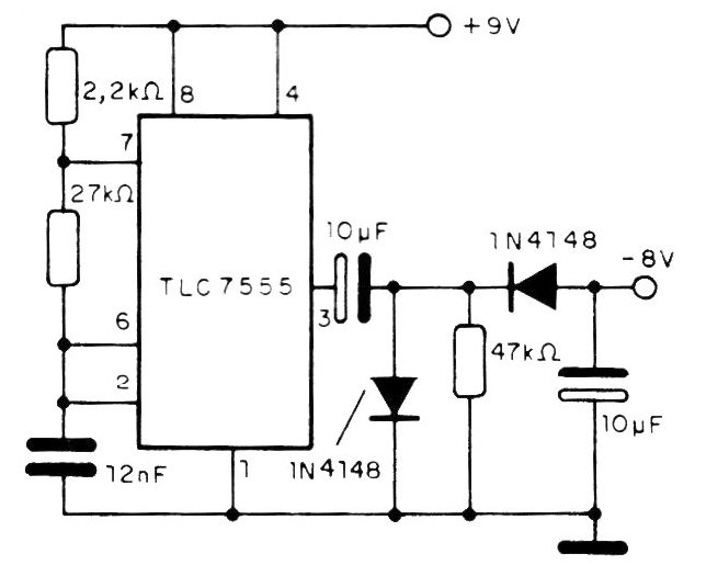 TLC7555, the 555 CMOS. It is a dc/dc converter that allows us to obtain a negative voltage between 7 and 8 V. from a positive voltage of 9 V. This application is interesting for cases in which if a symmetrical supply is required and the intention is to use a single 9 V battery in the project. With a load of 0.5 mA at the output, the voltage obtained is of the order of 7 V. The inversion of polarity and rectification is done by diode bridge at the output and the filter electrolytic capacitors. The operating frequency is determined by R1 R2 and C1 and can be changed according to the desired application.