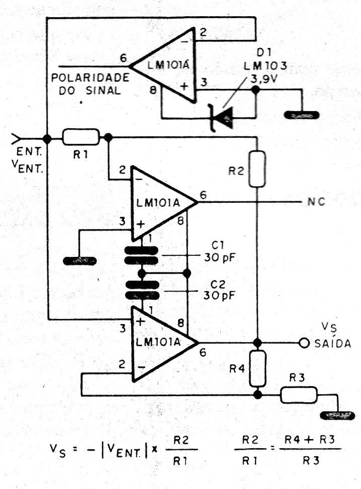This interesting circuit provides an output proportional to the input voltage, regardless of its polarity and, in addition, it has a second output for indicating polarity. The base is the LM101A and the circuit is shown in the figure. The gain depends on the R1 / R2 ratio, according to the formula given next to the diagram. The other resistors must maintain the ratio, also indicated in the diagram. The choice of resistors will depend on the amplitude of the signal you intend to work with.