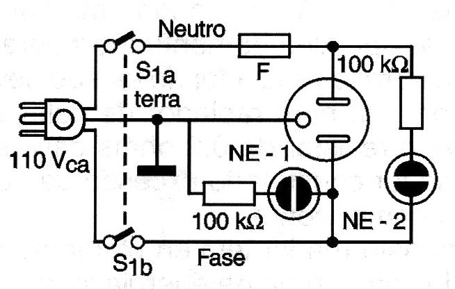This circuit tests the earth connection in computer outlets and other equipment that requires this connection for safety reasons. Place the device under test in the socket and the two neon lamps should light up if all is well. The fuse has to be according to the power of the devices that are normally connected to the circuit. Neon lamps are common for the type that does not have the current limiting resistance internally.