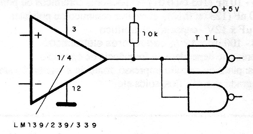 In the figure, we show the way in which integrated voltage comparators of the LM139, 239, 339 and CA139, 239 and 339 series can excite two or more TTL ports. The 10k resistor serves as a load for the comparator and at the same time, it polarizes the TTL inputs. Note that the comparator is powered with the same 5 V as the digital TTL system.