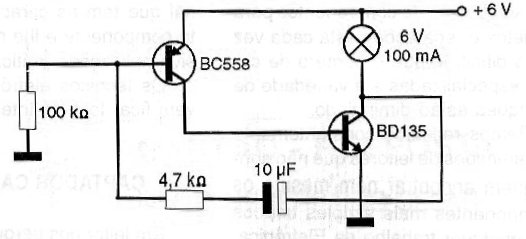 This circuit can be used for signaling a panel with a common incandescent lamp. The lamp will flash at a speed given by the 10 uF capacitor and the 100k ohms resistor. These components can be changed over a wide range of heat. Likewise, a 12volt lamp allows the circuit to operate at this supply voltage.