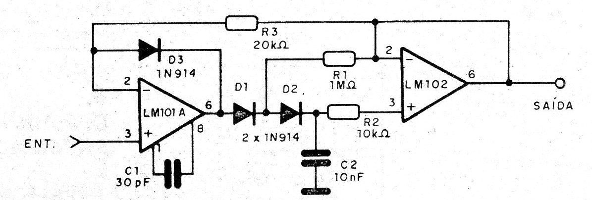 The circuit in the figure uses two operational amplifiers: an LM101A and an LM102. Diodes admit equivalents and resistors do not have to be accurate. The power supply must be symmetrical.