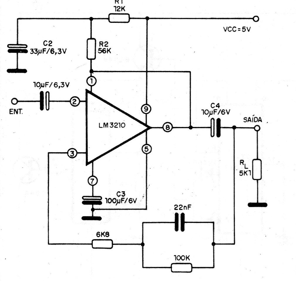This SANYO circuit has a typical input resistance of 1ook9 and excites a load with a resistance of 5.1k ohms, consisting of an amplifier for small signals for use in car radios and recorders. The voltage gain is typically 35dB.