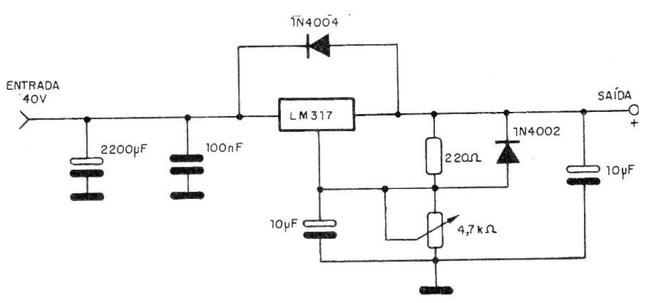A current of up to 1.5 A can be obtained with this regulator circuit, whose output voltage will be adjusted in the range indicated by the 4k7 ohm potentiometer. The filter capacitor at the input can be increased to further reduce the ripple. The integrated circuit must be mounted on a good heat sink. Capacitors must have working voltages compatible with the regulator input and output.