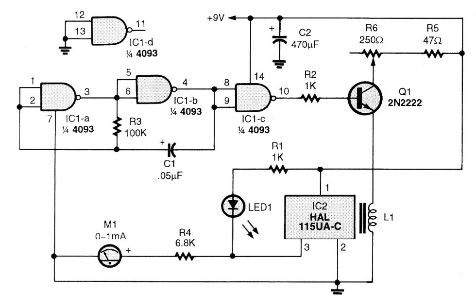 This circuit is from a 2001 Poptronics. The magazine no longer exists, but the components used are still easy to obtain, except for the sensor that can be replaced with an equivalent one. The explorer coil, on which the sensor must be mounted, consists of 500 loops of wire 32 in a ferrite rod approximately 15 cm long and 1 cm in diameter. Power can be sourced by battery or cells.