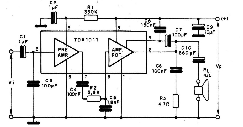 This is an integrated recommended for portable amplifiers, recorders, and battery powered radios. It provides a power of up to 4.2 W with a load of 4 ohms and can be powered with voltages in the range of 3.6 V to 18 V. Like the TDA1011, with which it is compatible, it is presented in a 9-pin SIL enclosure. The advantages of this integrated, the circuit and the table with the powers depending on the voltage are the same as those of the CB15971E amplifier.