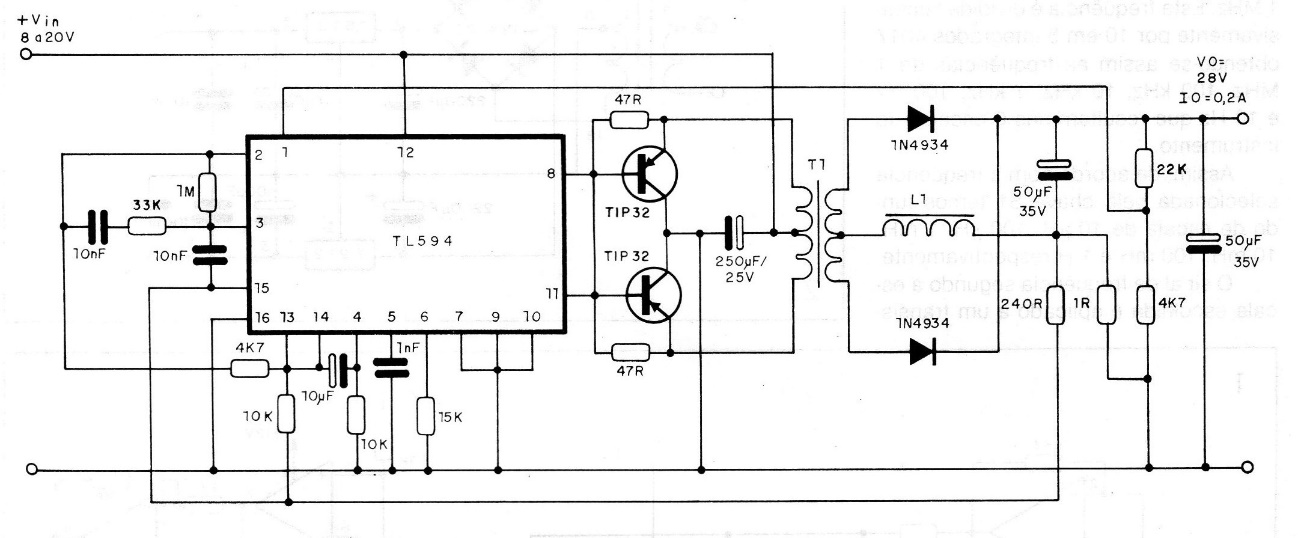 This inverter, suggested by Motorola, converts a voltage from 8 to 20 V into 28 V with a maximum output current of 200 mA. The push-pull circuit is based on an integrated circuit for switching source type TL594 and two power transistors that must be mounted on convenient heat radiators. The T1 transformer has a primary with 20 turns of 28 AWG wire and a secondary with 120 turns of 36 AWG wire in a 140xp-100-3C8 ferroxcube core. The L1 reactor is 3.5 mH for 300 mA current.