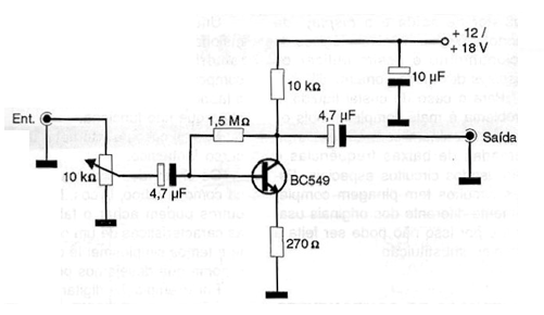 This low noise audio amplifier stage uses only one transistor and has a high enough gain to operate with low intensity signal sources. The gain is basically given by the 1.5 M ohms resistor that must be changed according to the characteristics of the signal source. The supply can be done with voltages of 12 to 18 volts and the potentiometer acts as a gain control.