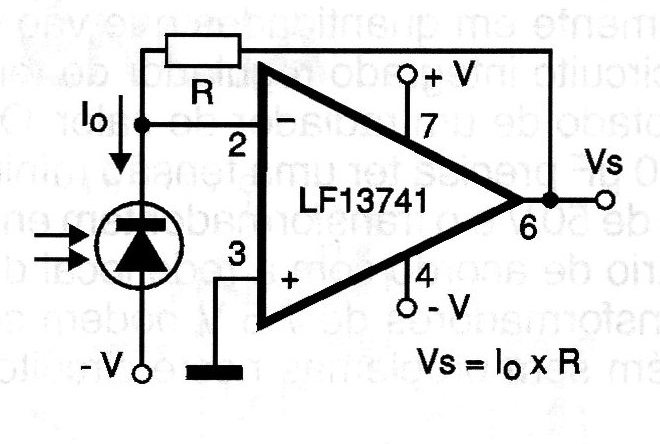 The gain of this circuit is given by the value of R1 that depends on the current in the photodiode. The current in the photodiode is a function of both the lighting and its characteristics. The circuit can be used as an interface for infrared sensors or even remote controls. The operational amplifier must be supplied with a symmetrical source of 6 to 12 V. Equivalent operational amplifiers can be used, and only possible high frequency modulation of the signals should be considered, which must be within the operating capacity of the chosen component.