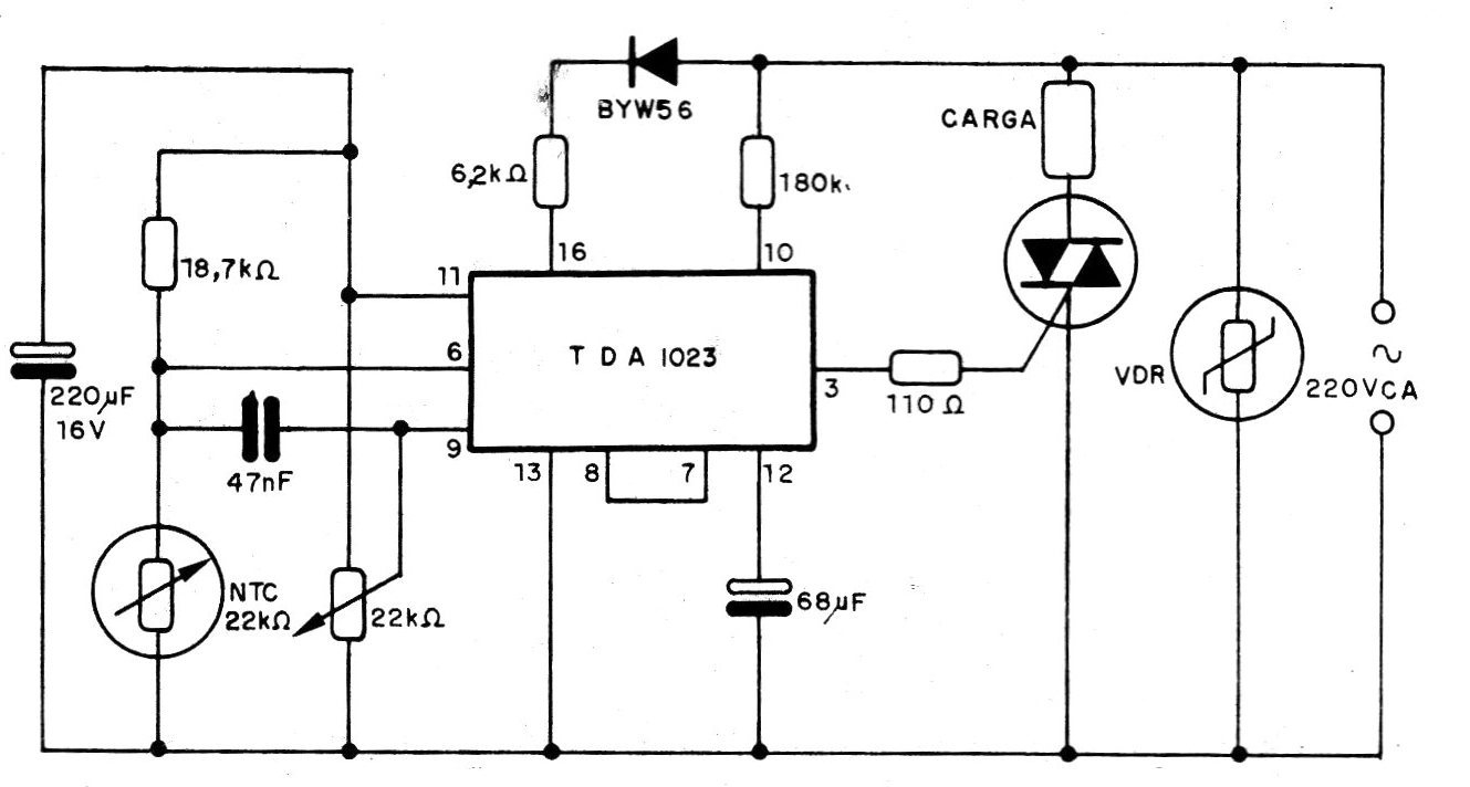 Although the TDA1023 integrated circuit is no longer very common in our market, it can be used in this interesting high-power thermostat with triac. The trigger adjustment is made in the trimpot and the controlled power depends only on the triac. The VDR serves to protect the circuit against transients.