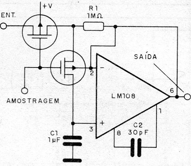 This sample and hold circuit uses an LM108 operating system that is no longer common today. FETs can be of any type of 4 MOS terminals and equivalent operational ones can be employed. The power supply must be symmetrical. The circuit is suggested by National Semiconductor.