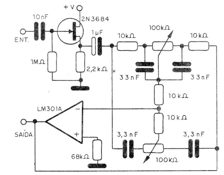 This circuit, suggested by National Semiconductor, is a tone control (bass and treble) with high input impedance and is based on a FET and an operational amplifier. In the figure we have the complete diagram of the device, which uses linear potentiometers of 100k ohms. The field effect transistor admits equivalent, and one of the most important characteristics of the circuit is the low noise.