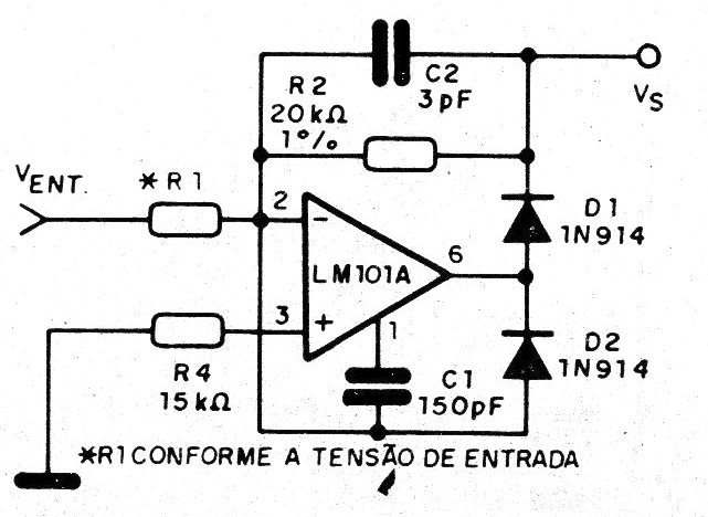 The circuit shown is based on the LM101A; diodes can be replaced with equivalents. Resistor R1 must have a tolerance of 1%. In this circuit, the rectified output voltage has twice the frequency of the input voltage and can also operate as a simple bender. The power supply must be symmetrical.
