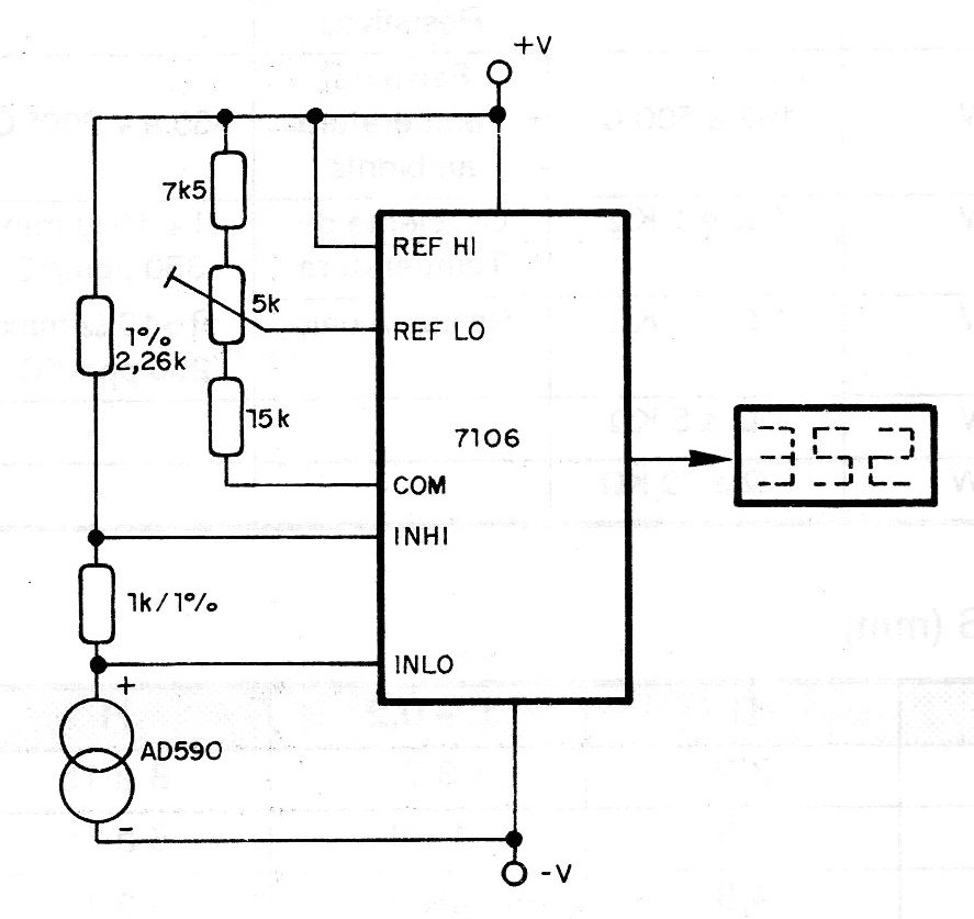 This circuit suggested by Intersil, provides a Kelvin scale of 3 and a half digits in a 7106, with good precision. The supply must be 9 V symmetrical and the AD560 is a 3-terminal temperature sensor, whose characteristics are given in IP1243.