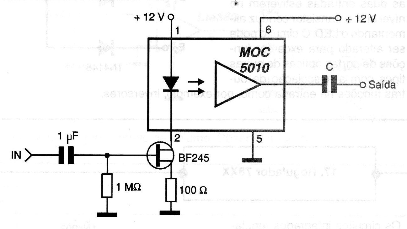 The Motorola MOC501O optocoupler has a complete amplifier inside the sensor, enabling the development of a linear signal coupler that allows it to operate in the audio range. It uses a common junction FET at the input to couple the input signal and can be supplied with 12 v voltages. Capacitor C must be chosen according to the input impedance of the stage in which the signal will be applied to allow a good coupling.
