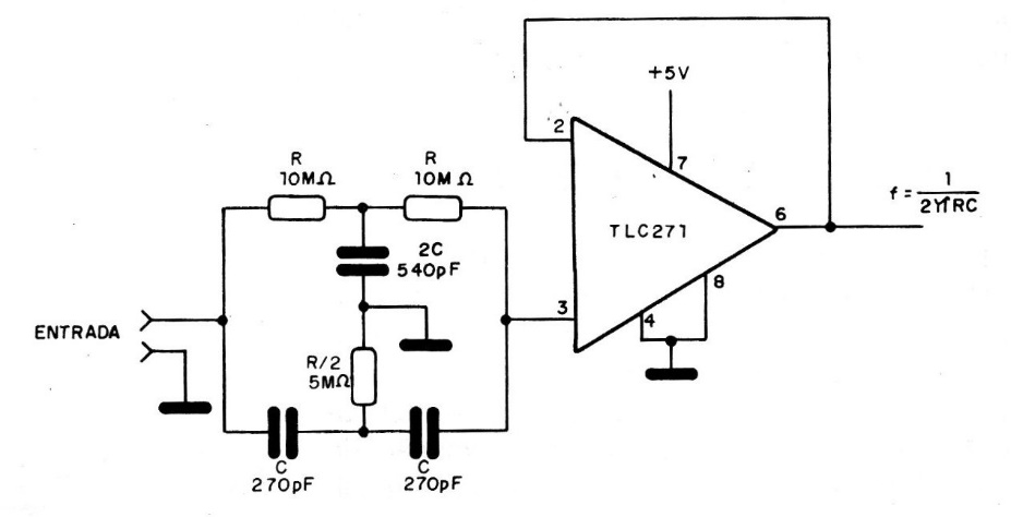 This filter rejects 60 Hz signals and can be used as a hum filter in audio equipment, for example, at the entrance of microphones with long cables. Double T resistors and capacitors must have good accuracy to ensure operation at the desired frequency. At this frequency, we have an attenuation of 39 dB, while for the other frequencies, the gain of the circuit is unitary. Note that this circuit does not use a symmetrical power supply. The TLC271 is an operational amplifier with field effect transistors from Texas.
