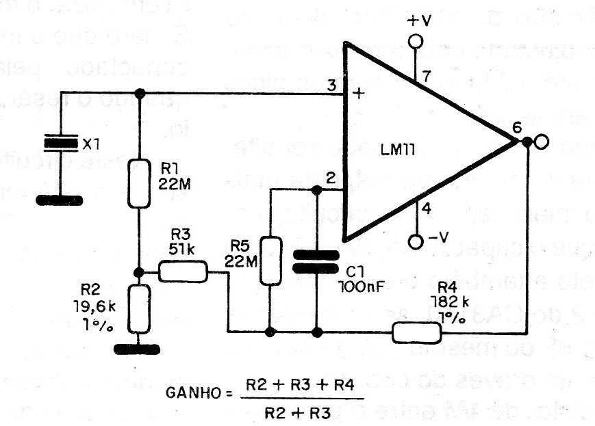 This amplifier, suggested by National Semiconductor, is characterized by its very high input impedance of 880 Megohms, and makes use of an operational LM11. The power supply must be symmetrical from 9 to 15 Volts and the resistors at the most critical points must be within 1% tolerance. One of the applications for this circuit is in vibration sensors, or even in audio.