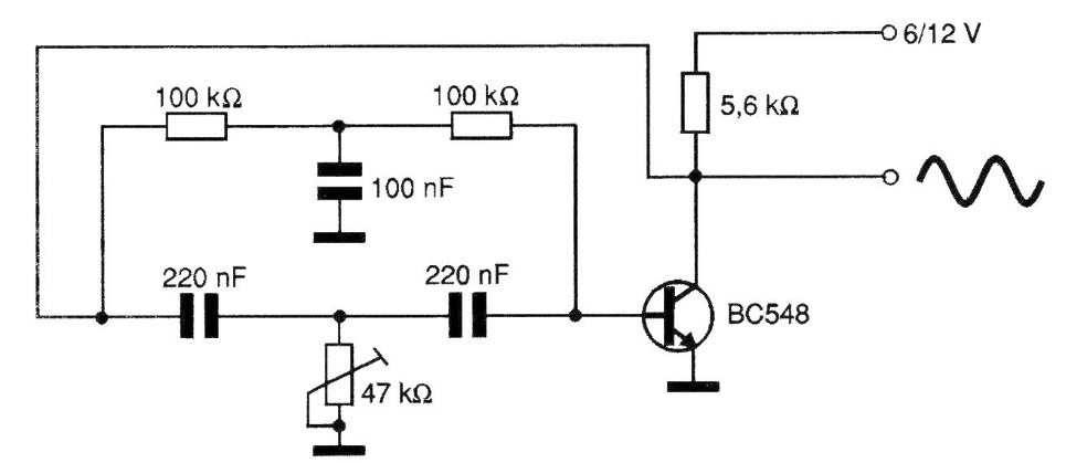 The twin-T oscillator shown in the figure generates sinusoidal signals in the audio track, which depend on the double T values, which must maintain the indicated value relationships. The trimpot adjusts the oscillation point. For the indicated values, the generated signal will be around 1 kHz.