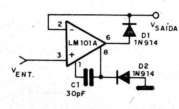 A diode with precision characteristics can be simulated with the figure circuit based on the integrated LM101A. 1N914 diodes can be replaced with equivalents such as 1N4148. The power supply must be symmetrical as in other applications.