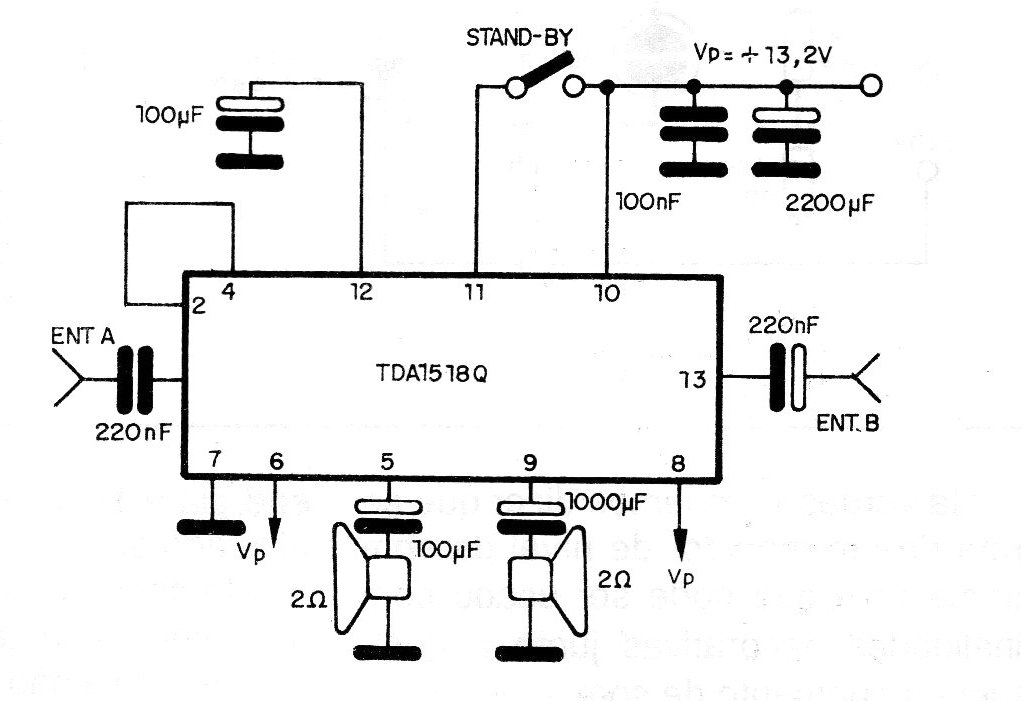 This amplifier provides an output power of 11 watts per channel on load of 2 ohms (stereo), with a power supply of only 13.2 Volts which makes it especially suitable for automotive applications. The circuit is suggested by Philips Components and has 30k of input impedance with a peak consumption current of 4 amps. The integrated is presented in a 13-pin DIL housing suitable for mounting on a heat radiator. The quiescent current is 30mA and it has a switch for standby condition with a consumption current of only 0.1 uA (typ.)