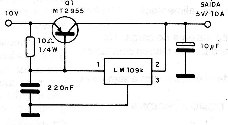 This powerful regulator, shown in the figure is for 5V (TTL) is suggested by Motorola and makes use of an integrated LM108k. The power transistor supports an equivalent that must be mounted on an excellent heat radiator. The 10 uF capacitor must be mounted next to the output and the 220 nF capacitor as close as possible to the integrated input.