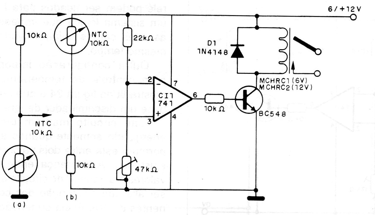 The sensor is an NTC and in the connection as shown in figure (a) we have the trigger with the temperature rise and in (B) with the fall. The relay is 50 to 100 mA of trigger current and voltage comparators of the LM139 series can be used. Adjustment of the trigger point is made in the trimpot.