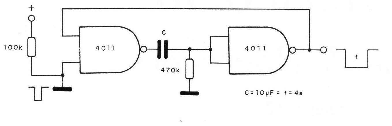 The circuit in the figure trips with a negative transition of the input signal, its output remaining at the low level for a period that depends on capacitor C and the 470k resistor. With C = 10 uF we obtain an output pulse of approximately 4 seconds. The values of C and R can be changed over a wide range of values. We can use both an integrated 4001 and 4011 in this circuit since the gates are used as simple inverters.
