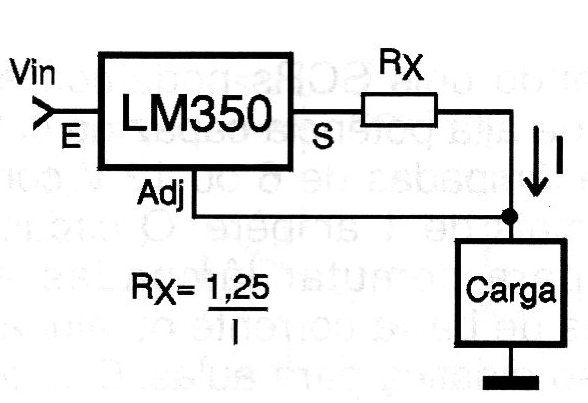 The current can be kept constant in the load circuit using the integrated regulator LM350. The presented circuit can be used with currents up to 3 A. The value of the resistor RX is calculated according to the current that is wanted in the load according to the formula next to the diagram. The 1.25 of the formula is the value of the zener diode internal to the LM350. The integrated circuit must be equipped with a heat sink for currents above 100 mA in the load.