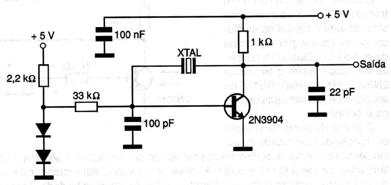 This oscillator uses a general-purpose transistor that can have BC548, BF494 or 2N2222 equivalents and generates a signal determined by the frequency of the crystal. The two diodes are for general use and the supply voltage is 5 V. The three capacitors must be ceramic. Other frequencies in the range of 1 to 20 MHz can be generated by the same circuit.