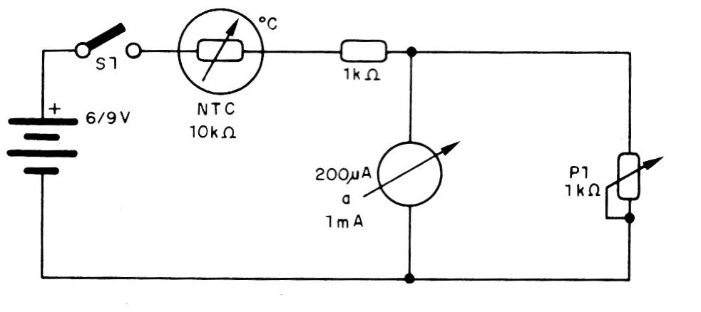In the figure we have a simple thermometer with NTC, using an analog current indicator. The adjustment is made in the trimpot and the power is done by batteries.