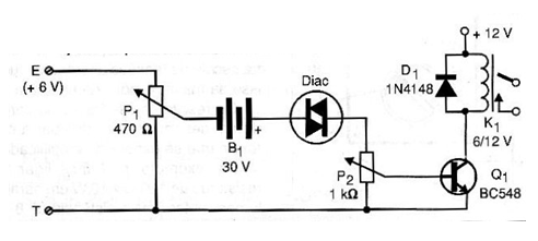 The voltage of 30 V indicated in this project, shown in the figure depends on the diac used. It should be slightly lower than the one needed for your shot. P1 adjusts the trigger voltage. This voltage is added to that of the battery to arrive at what is necessary to trigger the diac. When this occurs, there is the conduction and polarization of the transistor that has a relay as collector load. The potentiometer or trimpot P2 must be adjusted to obtain the saturation current of the transistor as a function of its gain. The relay used depends on the voltage used in its supply and the load current that must be controlled.