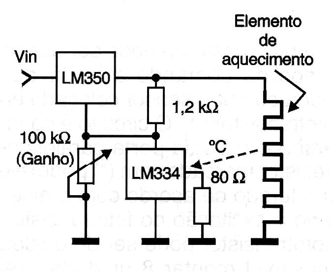 A low voltage heating element (up to 30 V) with a current of up to 3 A can be precisely controlled with the circuit presented here. The setting of the operating point (temperature) is done in the 100k ohms potentiometer. The temperature sensor must be installed in the same location as the heating element. The integrated circuit must be mounted on a heat radiator. The input voltage must be at least 3 V more than the voltage that must be applied to the heating element, under the conditions of maximum temperature.