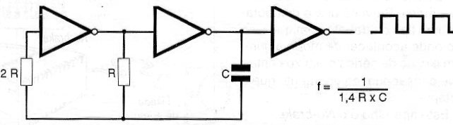 The oscillator presented uses two inverter buffers as a base and the frequency, which depends on the resistors and the capacitor, has its value given according to the formula next to the diagram. If CMOS inverters are used, the resistors can typically have values in the range of 10k to 100k ohms and the maximum operating frequency will be around 2 MHz. Power must be supplied with voltages in the range of 3 to 15 volts.