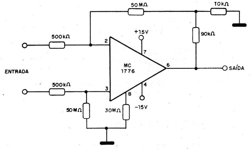 The circuit shown is suggested by Motorola and consists of an amplifier with very high input impedance. The voltage gain is 100 times and is given by the ratio of values between the input resistor and the feedback resistor. The input resistor also determines the input impedance. The power supply must be symmetrical with the indicated voltage. The same configuration can be adapted for use in other common operational amplifiers.