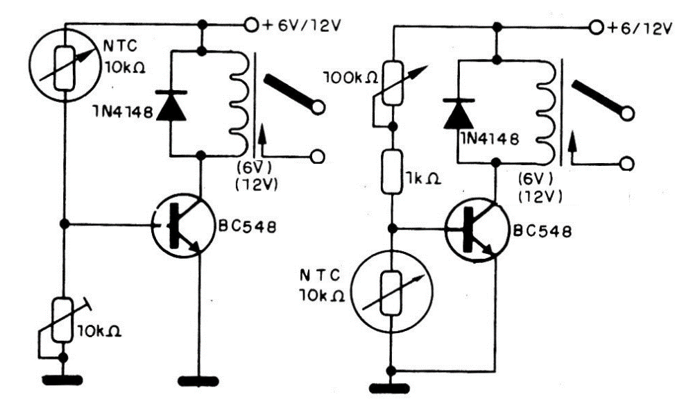 The two circuits shown trigger relays with temperature variation, the first being the type that turns on the relay when the temperature exceeds a certain value and the second when it falls below a certain value. The relay must have a current in the range of 50 to 100 mA.