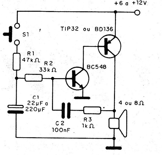 This circuit already incorporates the amplification stage, since the oscillator is of the type of power, which can excite a heavy speaker with up to a few watts. The output transistor can be the TIP32 or BD136, which must be equipped with a heat radiator. Modulation is manual. By pressing the pressure switch S1, capacitor C1 charges slowly, thus polarizing the oscillator, which starts the operation with a low sound and becomes slightly higher. When the pressure switch is released, the capacitor charges and the sound changes smoothly from high to low until it stops. The circuit feedback capacitor C2 determines the average frequency of the sound, together with the charge and discharge resistors. Depending on the application, the resistors can be replaced by 100 k ohm trimpots in series with 10 k ohms resistors, and the capacitor can have values between 22 nF and 100 nF. In the same way, we can change the rise and fall time of the sound, that is, the modulation effect, with the use of electrolytic capacitors for C1 in the range of 22 u to 220 uF.
