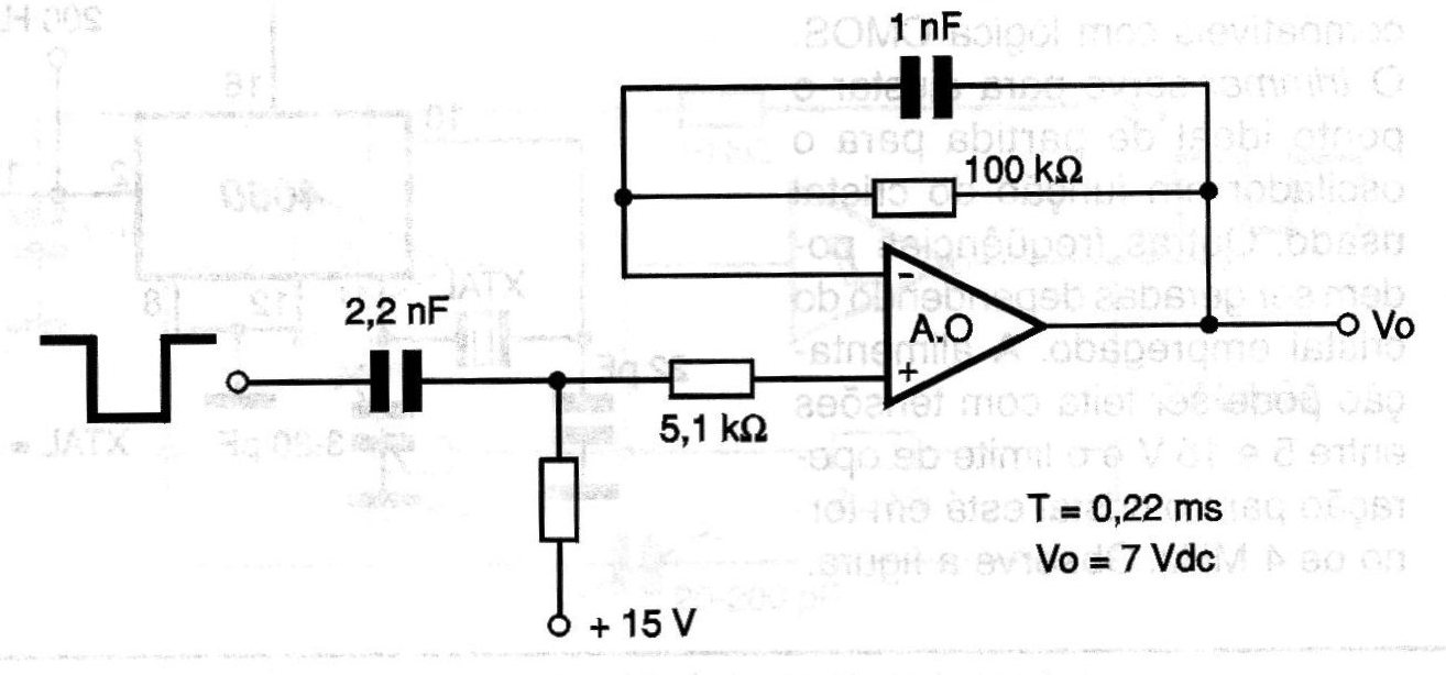 The circuit suggested in the figure differentiates the signal from the negative front of a rectangular signal. For the indicated circuit the time constant is 0.22 ms depending on the values of the components used, and the output voltage is 7 Vdc. The circuit employs any general-purpose operational amplifier and must be powered by a symmetrical 15 V + 15 V source.