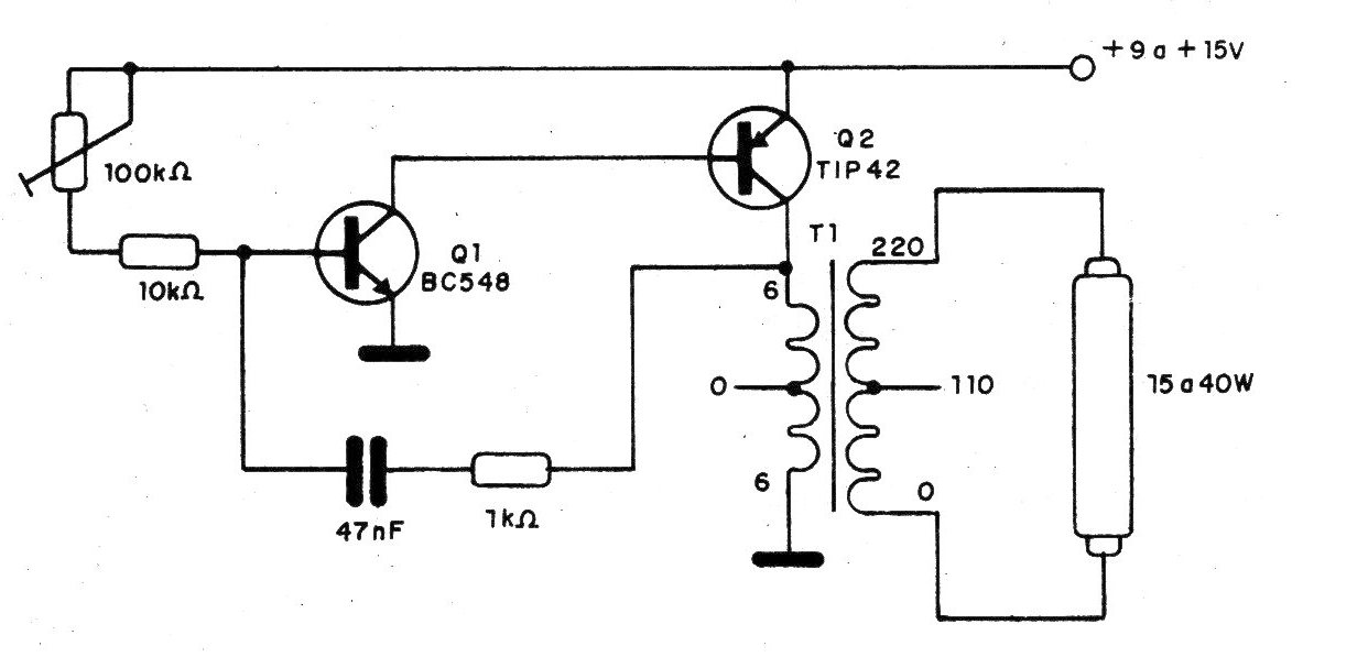 With this circuit we can light fluorescent lamps, even if they are exhausted, for normal operation in the power grid, from voltages between 9 and 12 V of batteries. The required current will be between 300 and 800 mA, depending on the supply voltage and the trimpot setting. The trimpot must be adjusted to obtain a higher brightness or the necessary brightness for the application depending on consumption. The transformer has a secondary of 500 mA at 1 A and the transistor Q2 must have a good heat radiator. Fluorescent lamps from 15 W to 40 W can be tried out.