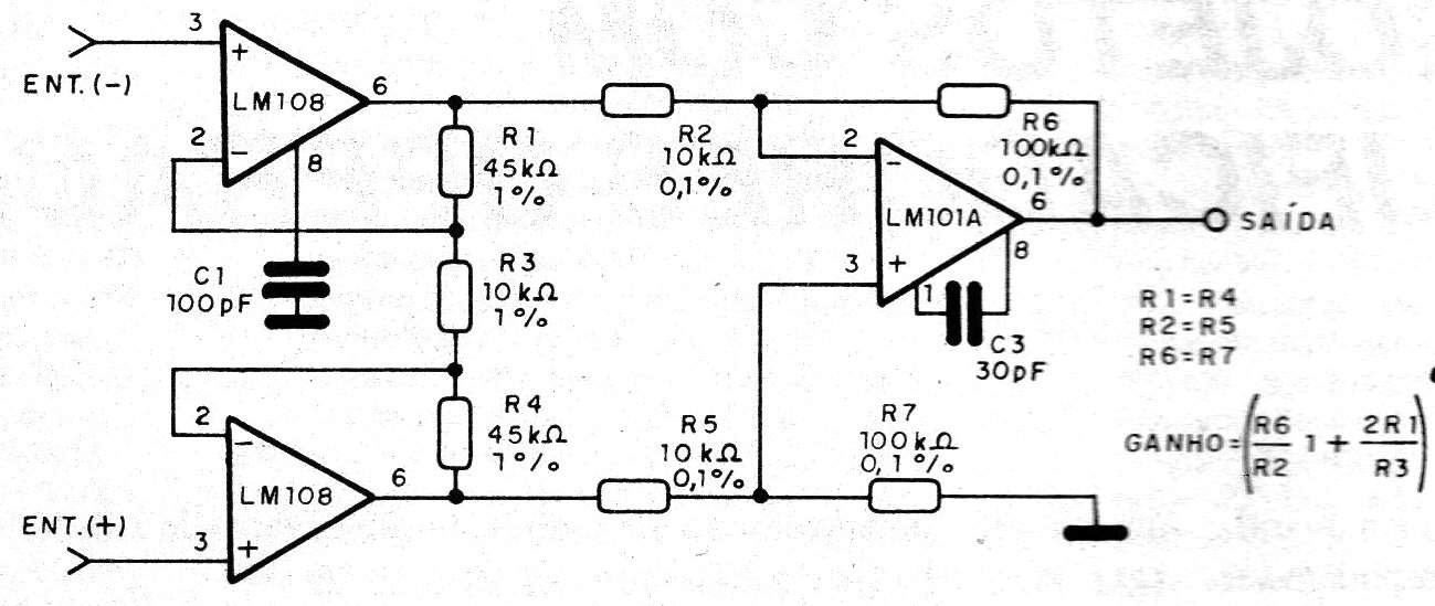 This second amplifier is based on the integrated LM108 and has a differential input. The resistor values and the formula that determines the gain are given in the diagram. Observe the need for narrow tolerance resistors, to guarantee the minimum of offset and consequently the rejection and in common mode (CMRR). The output stage based on an LM101A guarantees low impedance, for excitation of conventional steps or instruments.