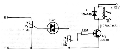 The circuit shown in the figure is triggered by an input voltage determined by the setting of P1. Of course, the voltage applied to this input must be equal to or greater than that required for the triggering of the Diac. The P2 adjustment is made so that we have the current necessary to saturate the transistor when the diac drives, without danger of excessive base current causing damage. The relay will depend on the voltage used in the supply and the type of load to be controlled. We remember once again the latch action of this circuit, which means that it keeps conducting when the input voltage falls below the trigger threshold. To disconnect, the input voltage must drop to zero.