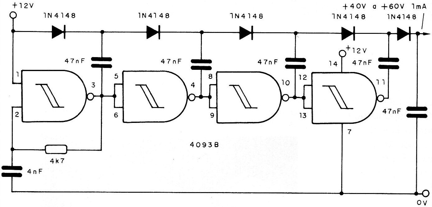The circuit in the figure generates a high continuous voltage, on the order of 40 to 6oV under a current of 1 mA from 12V supply. The first CMOS inverter port functions as an oscillator whose frequency can be changed in order to obtain the maximum performance. The following ports act as cascade-associated voltage doubler switching elements. The values of the capacitors used determine the current capacity of the circuit, but there are limits to their value, given precisely by the maximum current that we can obtain from the output of each port used. The circuit also operates with other voltages and the elevation at the output is proportional.